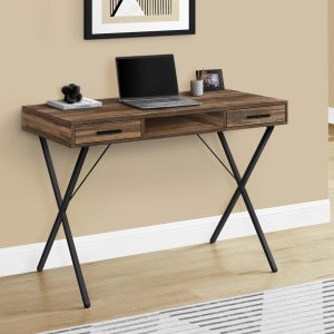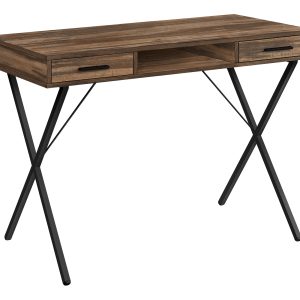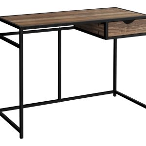 Slender metal frame in a black finish provides stability and contrasts the brown reclaimed wood-look laminate panels