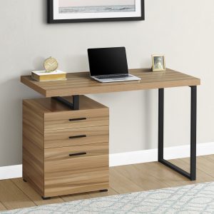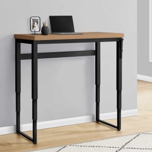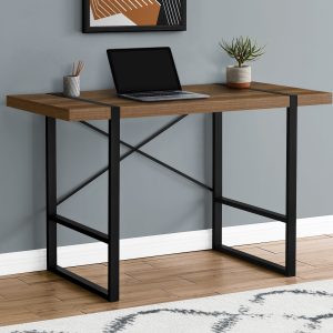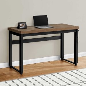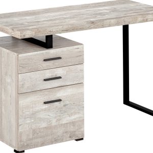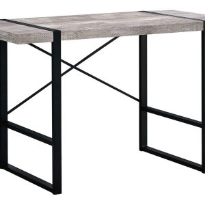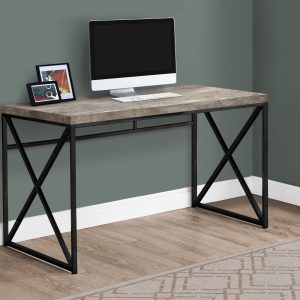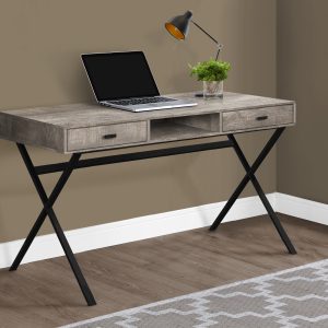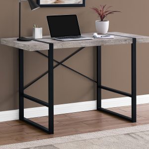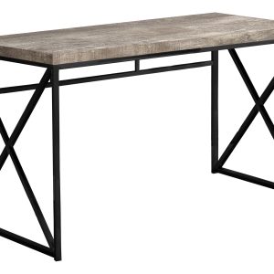 Thick panel taupe reclaimed wood look table top adds an industrial touch your home office space in a small home, apartment or condo
