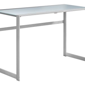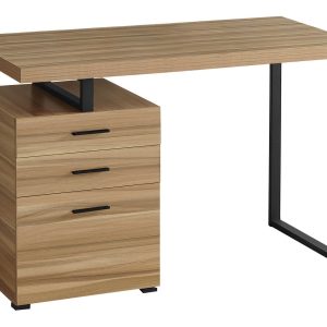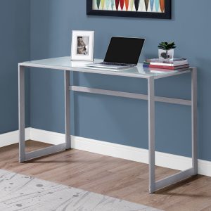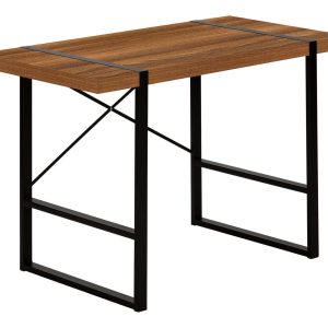 Robust metal legs in a black finish are incorporated into the desktop for an interesting visual effect