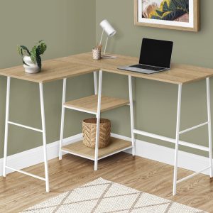 Solid rectangular corner desktop and 2 shelves in 2 different sizes are finished in a natural laminate with a smooth wood texture