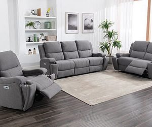Erik 3pc Power Recliner Soft Grey Fabric Set with charming hidden pull out Cupholders. A contemporary update on a classic design, this living room set anchors any living room ...