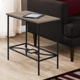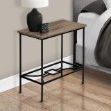 This 2-tier accent table features an open metal shelf that is both functional and decorative. Use the black metal storage shelf to hold unbreakable items, like a folded blanket or a plant in a plastic pot, or keep it empty to show off its geometric design, made of 2 curved lines connected by a square. The rectangular tabletop in a dark taupe wood-look finish offers a generous surface for placing a small table lamp and resting a cup of coffee or a mobile device. Round black metal legs have a delicate look but offer stability. Finished on all sides, this versatile end table with storage can be positioned in narrow or wide spaces as desired in a living room or bedroom.