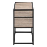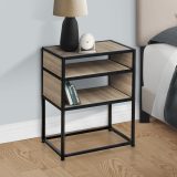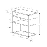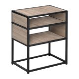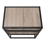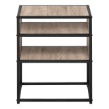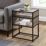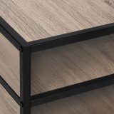 This accent table triples your storage options. The rectangular tabletop and two fixed open shelves with different heights offer flexibility for placing items you want to display or keep close by. The three tiers and matching side panels in a textured, dark taupe wood-look finish are supported by a sleek black metal frame for a modern, trendy look. Finished on all sides, it can be positioned in any direction to conveniently fit both narrow and wide spaces in living rooms or bedrooms.