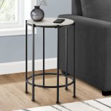 The perfect combination of style and functionality, this sleek and modern accent table brings fashionable style with a chic, washed oak laminate finish on the round table top and black metal legs. This trendy 24 inch high side table is not only a practical addition, but also has a space saving design with room for a lamp or decorative accessories, making a stylish statement in small spaces. Durably designed with an easy to clean top and sturdy metal legs, this accent table is built to last and comes with a 5 year limited warranty against manufacturer defects for your peace of mind. The easy to assemble design makes set-up a breeze and whether you use it as an end table, side table, or nightstand in your living room or bedroom, this accent table will add the perfect contemporary touch to your decor.