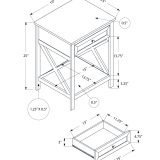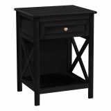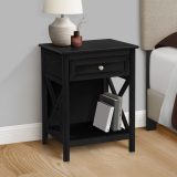 Bring the perfect combination of style and functionality to a room with this 2 tier, 25 inch high accent table. Designed in a transitional style, this space saving side table is finished in a chic black veneer with hints of red peaking through on all sides and accented with an x-design at each end for an upscale casual look. Place a lamp and some decorative accessories on the spacious, easy to clean top and set it next to a sofa or chair as an end table in a living room or use it as a nightstand in a small bedroom for a fresh look. Offering plenty of storage with a paneled drawer on smooth metal glides and complemented with a simple light gold knob, as well as a convenient bottom shelf for additional storage and display space. Easy to assemble with illustrated instructions, all parts and floor protectors included, this durably designed table is backed by a 5 year limited warranty against manufacturer’s defects for your confidence and satisfaction.