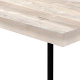 Thick, rectangular tabletop in a taupe reclaimed wood-look finish is wide to offer a more generous surface