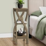 This contemporary accent table with curved legs offers a playful twist on displaying decorative items. The sturdy legs curve for a dynamic, twisting effect that will attract as much attention as the objects displayed on the table. Featuring a square tabletop and 2 shelves, its 3-tier design maximizes the vertical display space available in a living room, an entryway, or any room in need of a small table with storage. This side table in a dark taupe wood-look finish has a versatile style that can serve a variety of purposes, including as an indoor plant stand.