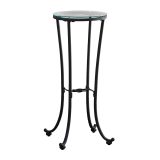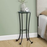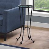 This simple yet elegant black hammered metal accent table with a clear tempered glass top is not only stylish for your living space, but also multi-functional. The round glass top has enough space to hold a beautiful plant or a cherished decorative item. With metal legs that gracefully curve out at the feet and the legs bonded together with a decorative knot for stability, this easy to assemble accent table brings a classic contemporary look to any room.