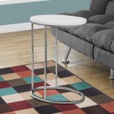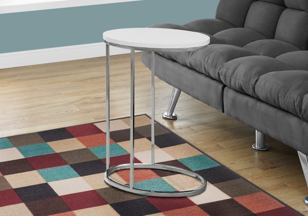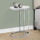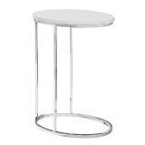 This modern oval accent table is the perfect combination of style and functionality. With a glossy white table top and oval chrome base, this accent table will add a contemporary touch to your living space. Designed to easily slip under your sofa to keep it conveniently close, this is the ideal accent table to hold your drinks, snacks, meals, or electronic devices. Lounging on the couch has never been more convenient! A truly versatile table for your living room, family room, den, or office.