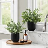 Our artificial plants offer a perfect and worry-free way to bring a touch of greenery to your living space. This two pack set includes both an 11″ tall indoor faux eucalyptus and a faux grass plant – offering a unique and fresh look with no maintenance required. Both plants feature adjustable leaves to give a full, lush look to the variegated green leaves that look and feel like the real thing. They are conveniently potted in sturdy cement and foam in 5″ black pots that can be placed anywhere on a surface with no clean-up required. This set of two plants is perfect for bringing a decorative accent to any home or office without the hassle of watering, wilting or light conditions. Environmentally-friendly and durable for a stylish, contemporary look that lasts, this set of indoor fake plants are a fuss-free way to spruce up your surroundings.