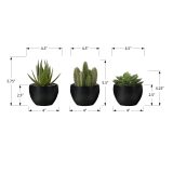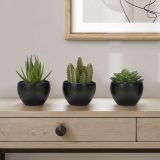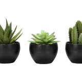Add a touch of nature to your home or office with this set of 3 artificial succulent plants standing up to 6″ tall. This sweet trio of faux green plants offer a no maintenance way to add some vibrancy to a room without the work. Our high-quality and durable decorative plants feature natural looking greenery that is hard to distinguish from the real thing. For indoor use only, each artificial plant is potted up in melamine black pots, with natural sand dressing on top, perfect for placing on tables, shelves, or other flat surfaces. Backed by a 5 year limited warranty against any defects, you will have the perfect accent for the home or office with this environmentally friendly set that requires no watering – simply unbox and enjoy these artificial tabletop plants!