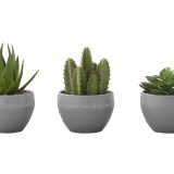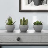 Add a touch of nature to your home or office with this set of 3 artificial succulent plants standing up to 6″ tall. This sweet trio of faux green plants offer a no maintenance way to add some vibrancy to a room without the work. Our high-quality and durable decorative plants feature natural looking greenery that is hard to distinguish from the real thing. For indoor use only, each artificial plant is potted up in neutral melamine grey pots, with natural sand dressing on top, perfect for placing on tables, shelves, or other flat surfaces. Backed by a 5 year limited warranty against any defects, you will have the perfect accent for the home or office with this environmentally friendly set that requires no watering – simply unbox and enjoy these artificial tabletop plants!