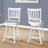 These counter-height swivel barstools with backs have a style that is as timeless as it is versatile. Gently curved backrests offer support and feature a classic slat-back design. The seats are cushioned for a soft feel and upholstered in a smooth, grey leather-look fabric. The round shape of the padded seats mirrors the ring-shaped footrests below that offer a place to relax your feet. Flared solid wood legs provide stability when the seats are rotated 360 degrees, and are in the same crisp, white finish as the backrests and footrests. Sold as a set of 2, these traditional barstools are a great choice for a kitchen island or casual dining areas with a counter-height table.