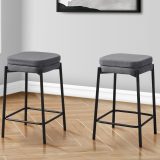 This sleek and stylish set of 2 barstools is perfect for adding a touch of contemporary to your kitchen or entertainment area. These backless stools feature a comfortable padded seat upholstered in a luxurious grey fabric that is easy to maintain. The sturdy construction design of the black metal legs with a convenient footrest, these stools are built to last and provide the ultimate support while you relax and unwind. Easy to assemble, with illustrated instructions and all parts includes, these fashionable style bar stools will be ready to start enjoying in no time. They include a 2 year limited warranty against any defects, so you can trust in the quality and durability of these highly functional stools. Pair these with a matching counter height dining table (sold separately) to upgrade your dining area with a touch of sophistication and comfort.