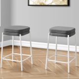 This sleek and stylish set of 2 barstools is perfect for adding a touch of contemporary to your kitchen or entertainment area. These backless stools feature a comfortable padded seat upholstered in a luxurious grey fabric that is easy to maintain. The sturdy construction design of the white metal legs with a convenient footrest, these stools are built to last and provide the ultimate support while you relax and unwind. Easy to assemble, with illustrated instructions and all parts includes, these fashionable style bar stools will be ready to start enjoying in no time. They include a 2 year limited warranty against any defects, so you can trust in the quality and durability of these highly functional stools. Pair these with a matching counter height dining table (sold separately) to upgrade your dining area with a touch of sophistication and comfort.