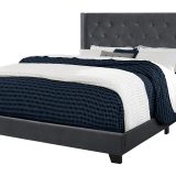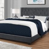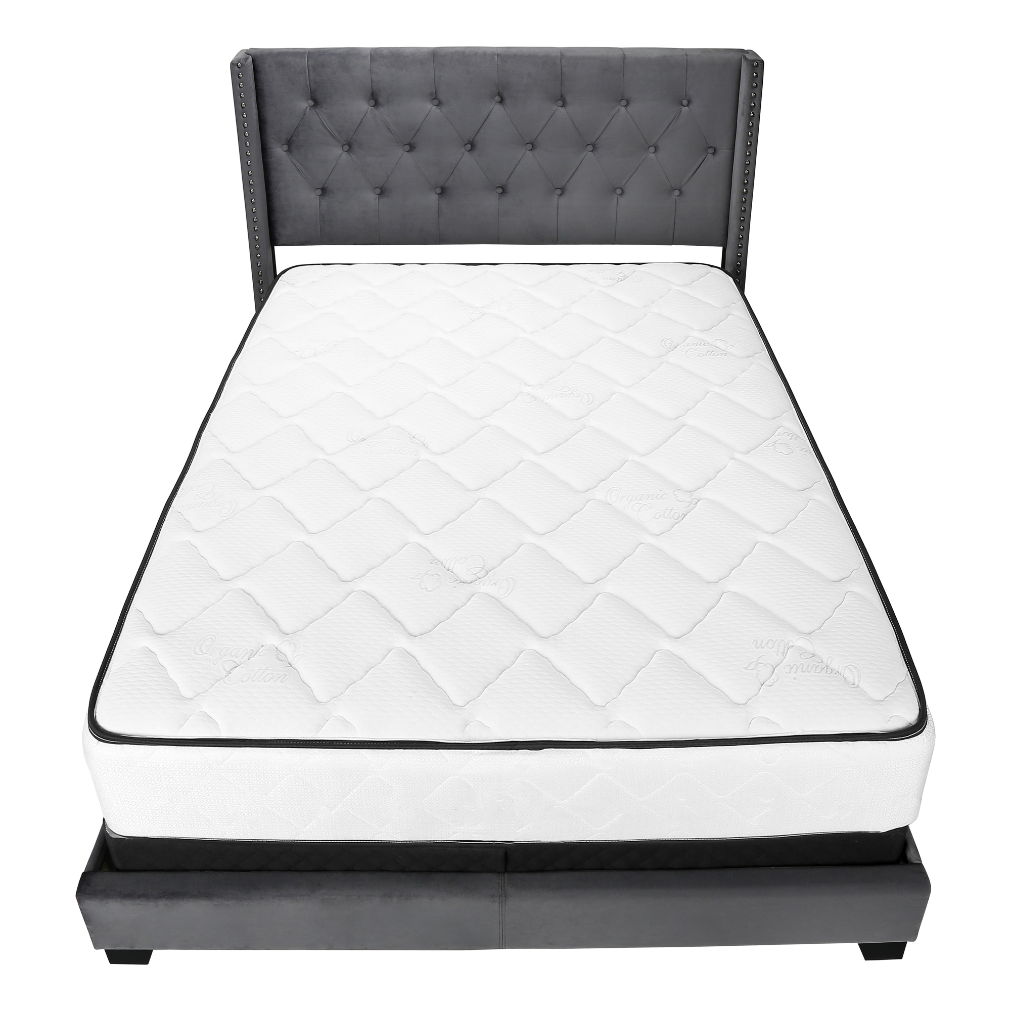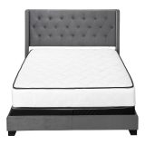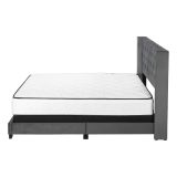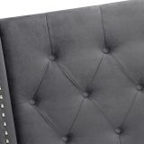 Give your bedroom a master appearance with this luxurious queen size bed frame with a wingback headboard upholstered in a rich dark grey velvet-look fabric. The classic contemporary style of this floor length headboard, outlined with chrome nail head trim down the sides and cushioned diamond tufting, gives the bed an understated flair. The clean lines of the upholstered sides and front frame along with the black block-style plastic legs, slightly angled at the front, adds stability to the whole bed frame. The box spring and mattress is not included and must be purchased separately. All parts and hardware for assembly are conveniently located inside the headboard.
