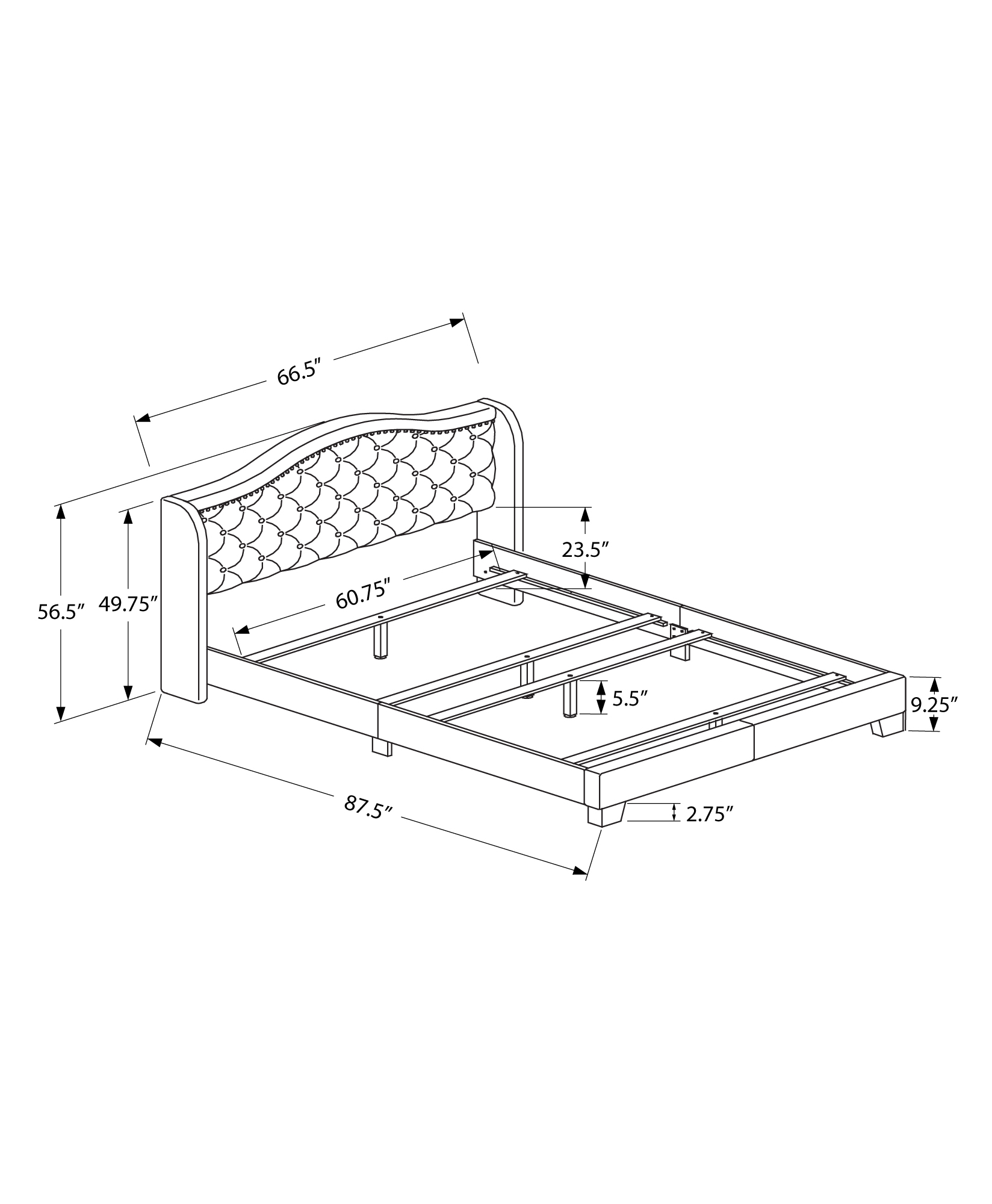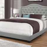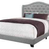 Give your bedroom a master appearance with this luxurious queen size bed frame and wing back headboard, upholstered in an elegant grey linen-look fabric. The gently curved classic style of this floor length headboard, outlined with a chrome nailhead trim and cushioned diamond tufting, gives the bed a statement making flair. The clean lines of the upholstered sides and front frame brings a contemporary touch. The black plastic block-style legs, slightly angled at the front, adds stability to the whole bed frame. The box spring and mattress is not included and must be purchased separately. All parts and assembly instructions are included.