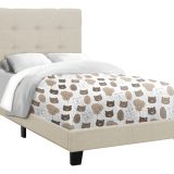 Create a striking look in the bedroom with this twin size platform bed frame. Covered in a chic beige linen look, soft touch fabric over thick foam cushioning along the tufted backrest and sides for a cozy feel. The upholstered solid engineered wood frame is fitted with wooden slats along the base for solid support, and black block style plastic legs for increased load-bearing weight and stability. Ideal for youth and juvenile spaces, this comfortable, upholstered bed is perfect in small homes, apartments or condos. Built with sturdy construction, this easy to assemble bed includes a 2 year limited warranty against manufacturer’s defects for your comfort. Spruce up your teen’s room in fashionable style with this transitional bed frame that comes in an array of fabulous colors. All parts and hardware for assembly are conveniently located inside the headboard. This bed includes the headboard and frame only. A box spring and mattress is required but not included (low profile recommended).