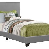 This contemporary upholstered bed frame finished in a grey leather look material, is set to decorate your bedroom with elegance. Including bold wooden slats for a durable construction, sturdy side rails and black block style plastic legs, stability is not a problem. This twin size bed frame fits nicely in tighter spaces of smaller homes, apartments or condos and will surely be the center of attention as soon as you step into your bedroom. Twin size mattress and box spring are required and not included (2 inch low profile recommended). All parts and hardware for assembly are conveniently located inside the headboard.