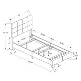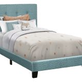 Create a fashionable style bedroom space for a youth with this trendy, twin size bed frame in a light blue boucle fabric and black block style plastic feet. This transitional style upholstered bed is designed with a classic, button-tufted padded headboard for comfortable support. The sturdy construction of the low profile, solid engineered wood frame and wooden slats to support a standard twin size box spring and mattress (not included) ensures long-lasting durability. Easy to assemble with illustrated instructions included and all required parts and hardware are found inside the back of the headboard for convenience. Backed by a 2 year limited warranty against manufacturer defects, this quality made bed frame is the perfect addition in a juvenile or teen bedroom for a cozy feel. A box spring is required (not included) for additional support, mattress not included. This bed is for the frame only.