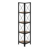Perfect for photo frames, plants, other decorative items and even kitchen accessories, this transitional-style corner bookcase will upgrade your decor. Including 4 solid medium brown reclaimed wood-look display shelves, this corner display unit features a three-leg black metal frame and a X-Design to add modern flare wherever you choose to place it. This corner etagere bookcase is sure to impress. Assembly is required.