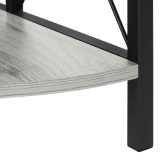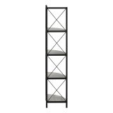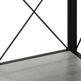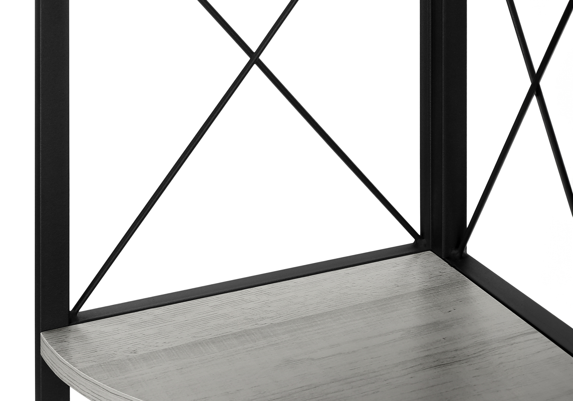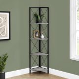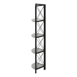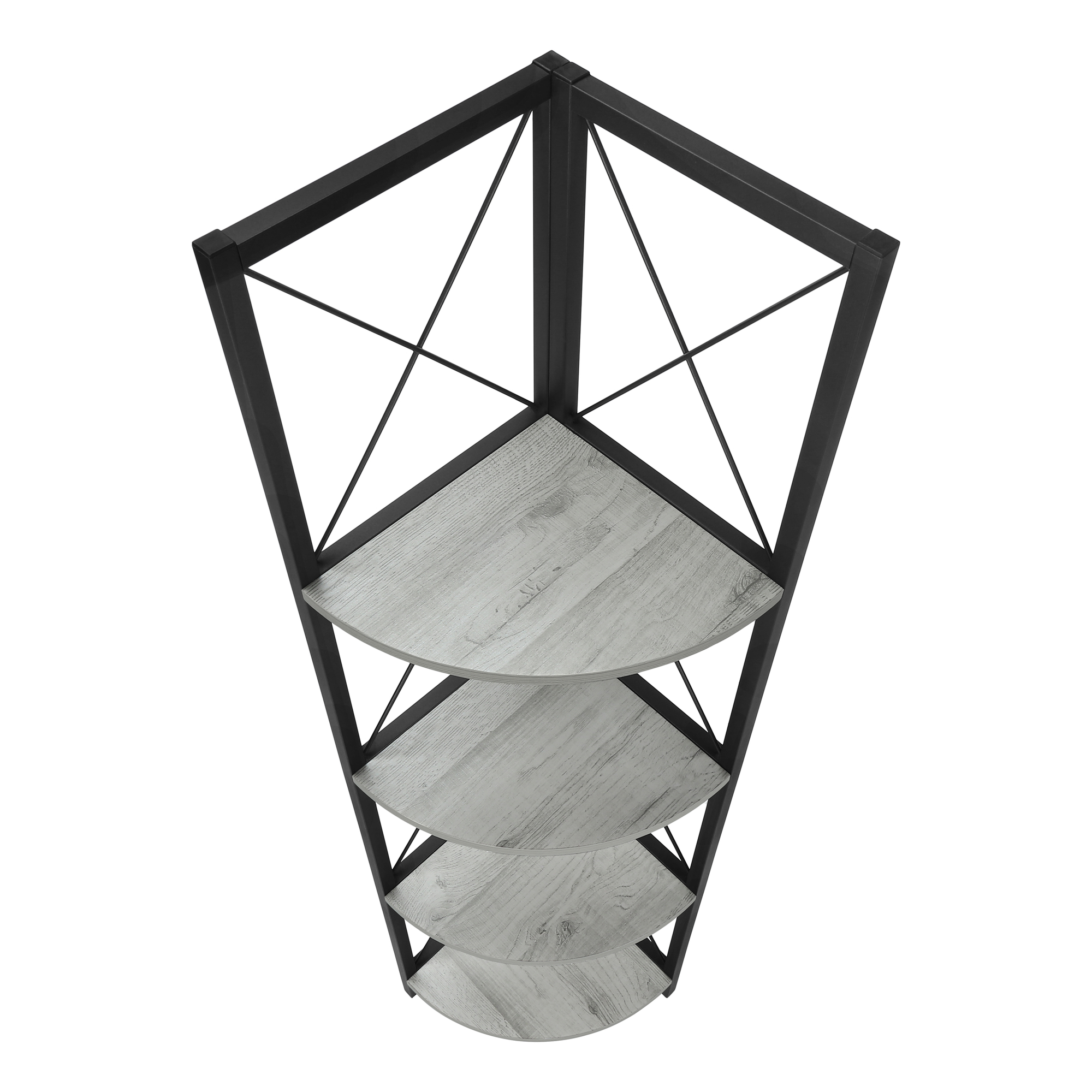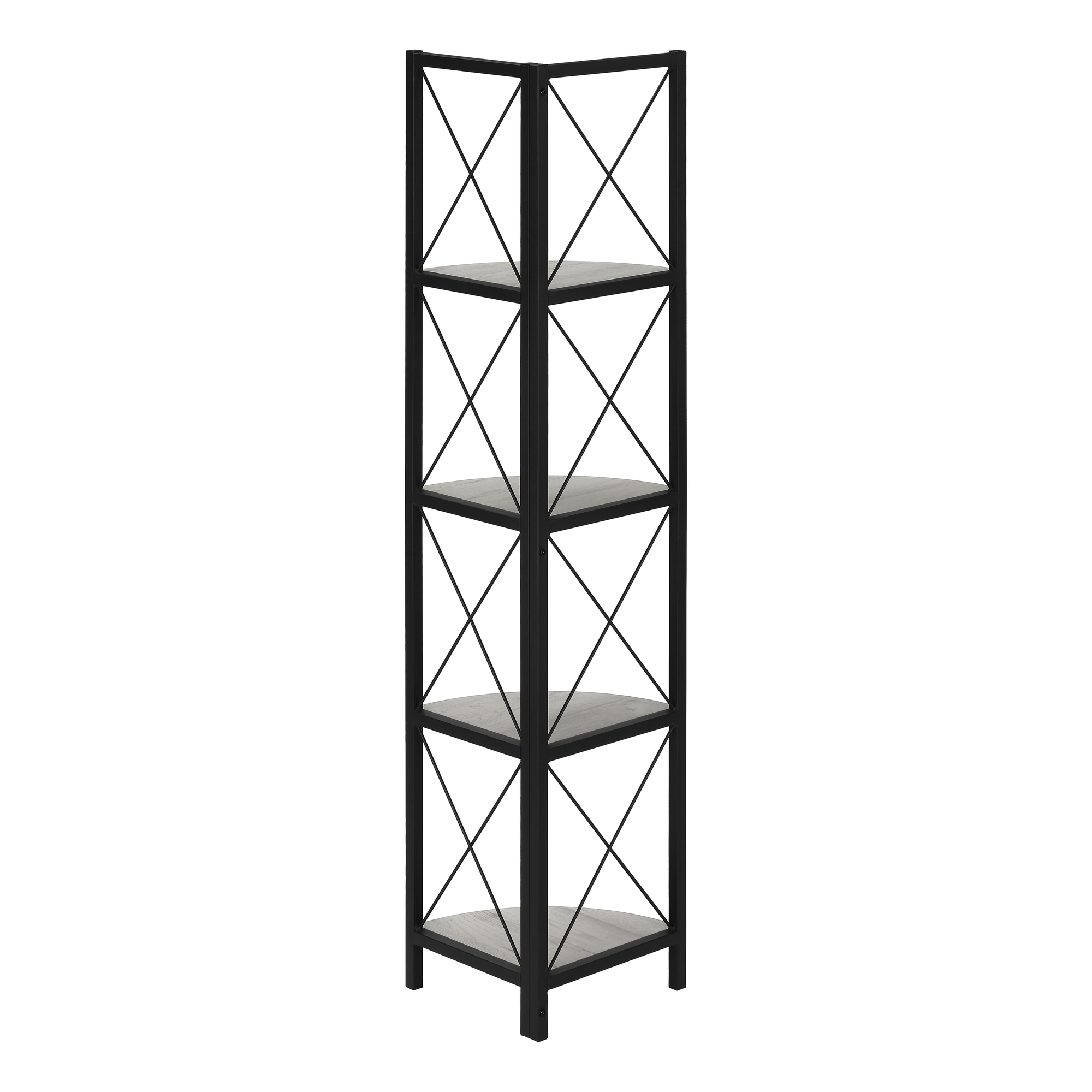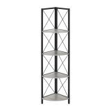 Perfect for photo frames, plants, other decorative items and even kitchen accessories, this transitional-style corner bookcase will upgrade your decor. Including 4 grey wood-look display shelves, this corner display unit features a three-leg black metal frame and a X-Design to add modern flare wherever you choose to place it. This corner etagere bookcase is sure to impress. Assembly is required.
