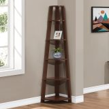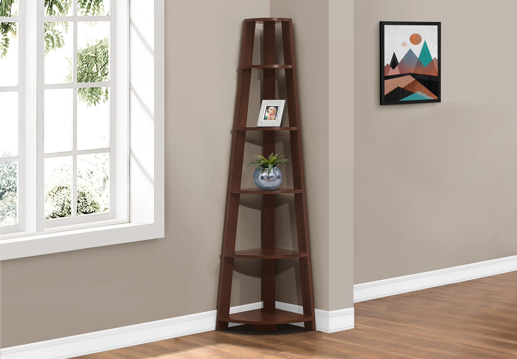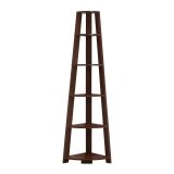 Set up this etagere bookcase easily and let it do its thing! Look how nice the bookcase fits in a corner of your living room, office or bedroom, allowing you to showcase books and all types of decor easily. Make use of a spot that is often tough to work with: the corner. Maximize storage and display with a modern piece that will be sure to help you utilize all the space available to you thanks to 5 fixed tray style shelves. Three sturdy beam legs ensure structural integrity to this corner ladder shelf in a cherry finished wood look texture. Anti-tipping hardware is included for further stability.