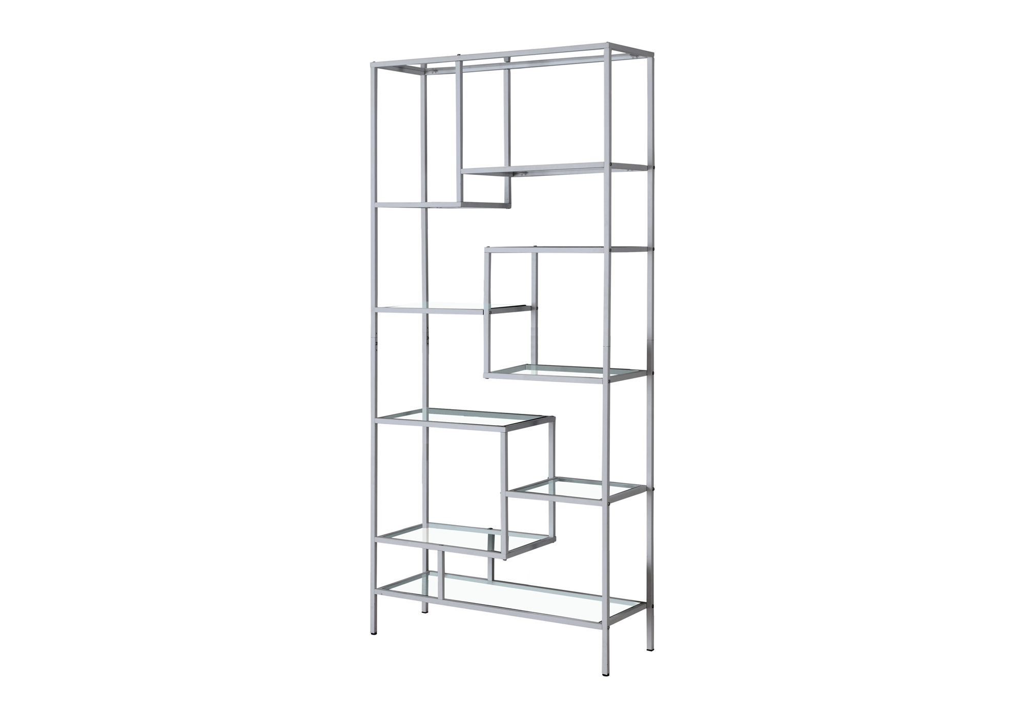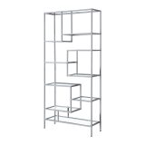 Show off your decorative items in style: plants, photo frames, books or even electronic devices thanks to this bold silver metal etagere bookcase simply made to impress. With nine tempered glass asymmetrical shelves, the backless bookshelf’s design blends perfectly in your living room, office, bedroom or entrance area of any small home, condo or apartment where space is limited. It’s the perfect accent piece to maximize space!