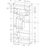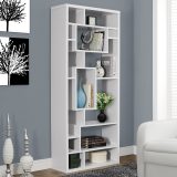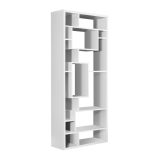 Give your home and office space a bold, modern look with this unique 72″ high smooth white bookcase, with thick paneling. This chic, backless storage unit features 14 asymmetrical shelves in various sizes, perfect for displaying your favorite books, pictures or other decorative items. Finished on all sides, you can place this bookcase against any wall or place it sideways as use it as a room divider for added versatility. Assembly is required.