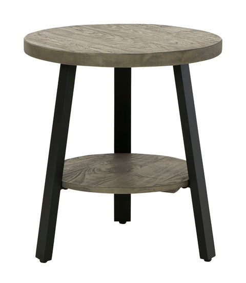This round end table is an achievement in urban contemporary styling. Its ultra-cool design pairs a thick slab-style tabletop and an open lower shelf of solid pine wood with linear metal legs. A weathered gray finish keeps the aesthetic warm and inviting.