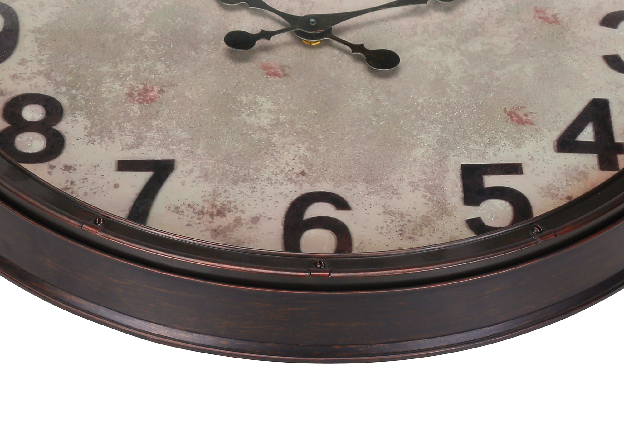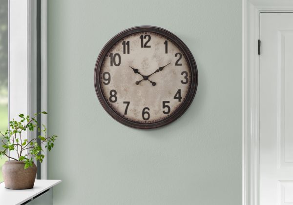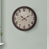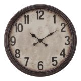Add a touch of vintage charm to your home decor with this stunning 20″ round wall clock. The easy to read analog clock features bold numerical markings on a parchment style paper background under a clear glass surface, all housed around a durable antique brown plastic frame. The accurate timekeeping is powered by a quartz movement, requiring just 1 AA battery (battery not included). With its non-ticking mechanism, this decorative clock is perfect for quiet environments, and includes 2 year limited warranty against any defects to enjoy without worry. So easy to display as there is no assembly required – simply hang it up and enjoy timeless style with this transitional accent piece. For indoor use only.