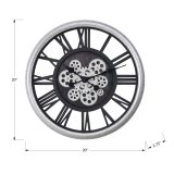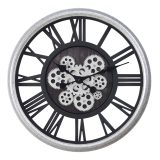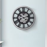 Features a unique moving gear mechanism in silver with black metal hands against a printed backdrop and quartz movement for accurate timekeeping.