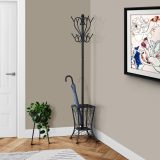 Enhance the look of your entryway or hallway with this black metal coat rack and umbrella stand. The two tiers with a total of 8 curved hooks paired with an elaborately scrolled basket offers the perfect place to store hats, jackets, scarves and umbrellas. The classic appeal of this coat rack lends itself to a stylish elegance reminiscent of a romantic Parisian apartment that will provide you with years of lasting enjoyment.