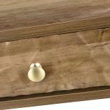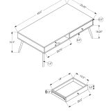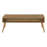Exquisite styling and exceptional functionality make this coffee table with storage a standout piece for a living room. A distinctive, rippled pattern on the drawer front delivers a captivating visual effect and adds an unexpected element of texture. Gold drawer knobs and detailing on the legs bring a subtle touch of glam. Solid wood legs, which are round and have a tapered shape, mix sturdy construction with chic design. Finished in a walnut wood-look laminate with realistic color variations, this mid-century modern accent table features a rectangular tabletop to display decorative items or serve cocktails and snacks, and 1 shelf and 1 storage drawer that offer convenient storage space.