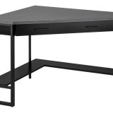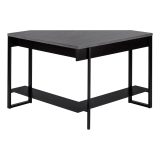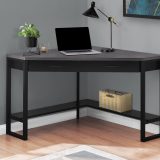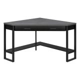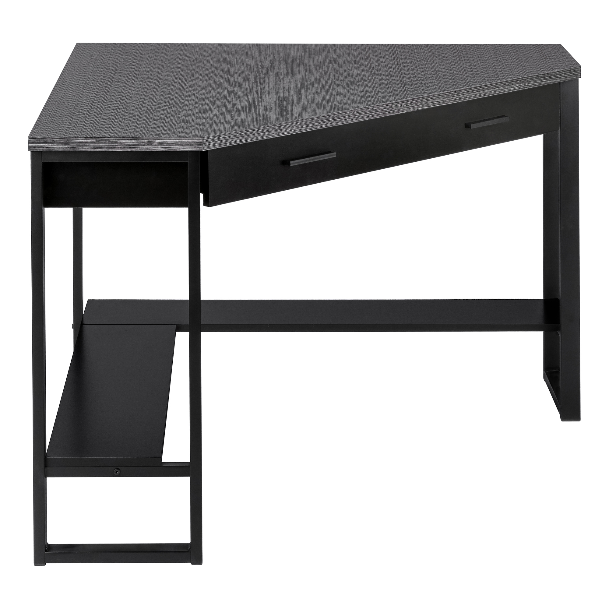 Turn the corner of your home office into a stylish workspace with this computer desk in a black finish. Its angular design saves space by fitting snugly in a corner. The desktop in a contrasting grey finish provides ample space for a laptop or computer monitor, desk lamp, and essential supplies. Keep the desktop clutter free by placing letter- and legal-size papers in the storage drawer. To make opening and closing the extra-wide drawer easy, it features 2 handles and metal glides. The L-shaped bottom shelf offers additional storage space and can hold a computer tower. Providing stability is a metal frame with exposed, rectangular legs in a black finish for a modern-industrial look.