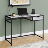 This computer desk with 1 storage drawer delivers stylish simplicity in a space-saving design. The desktop offers room for a laptop and the essentials you need to get work done. On the right, a storage drawer provides a convenient place to keep small supplies within easy reach. The drawer interior is finished in the same white marble-look laminate as the desktop panel and drawer exterior for a clean look. A slim yet sturdy metal frame in a black finish outlines the desktop and storage drawer for a modern-industrial touch. The streamlined style of this compact writing table makes it a great choice if your home office space is in a living room or bedroom.