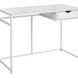 This computer desk with 1 storage drawer delivers stylish simplicity in a space-saving design. The desktop offers room for a laptop and the essentials you need to get work done. On the right, a storage drawer provides a convenient place to keep small supplies within easy reach. The drawer interior is finished in the same smooth, white laminate as the desktop panel and drawer exterior for a clean look. A slim yet sturdy metal frame in a white finish outlines the desktop and storage drawer for a modern-industrial touch. The streamlined style of this compact writing table makes it a great choice if your home office space is in a living room or bedroom.