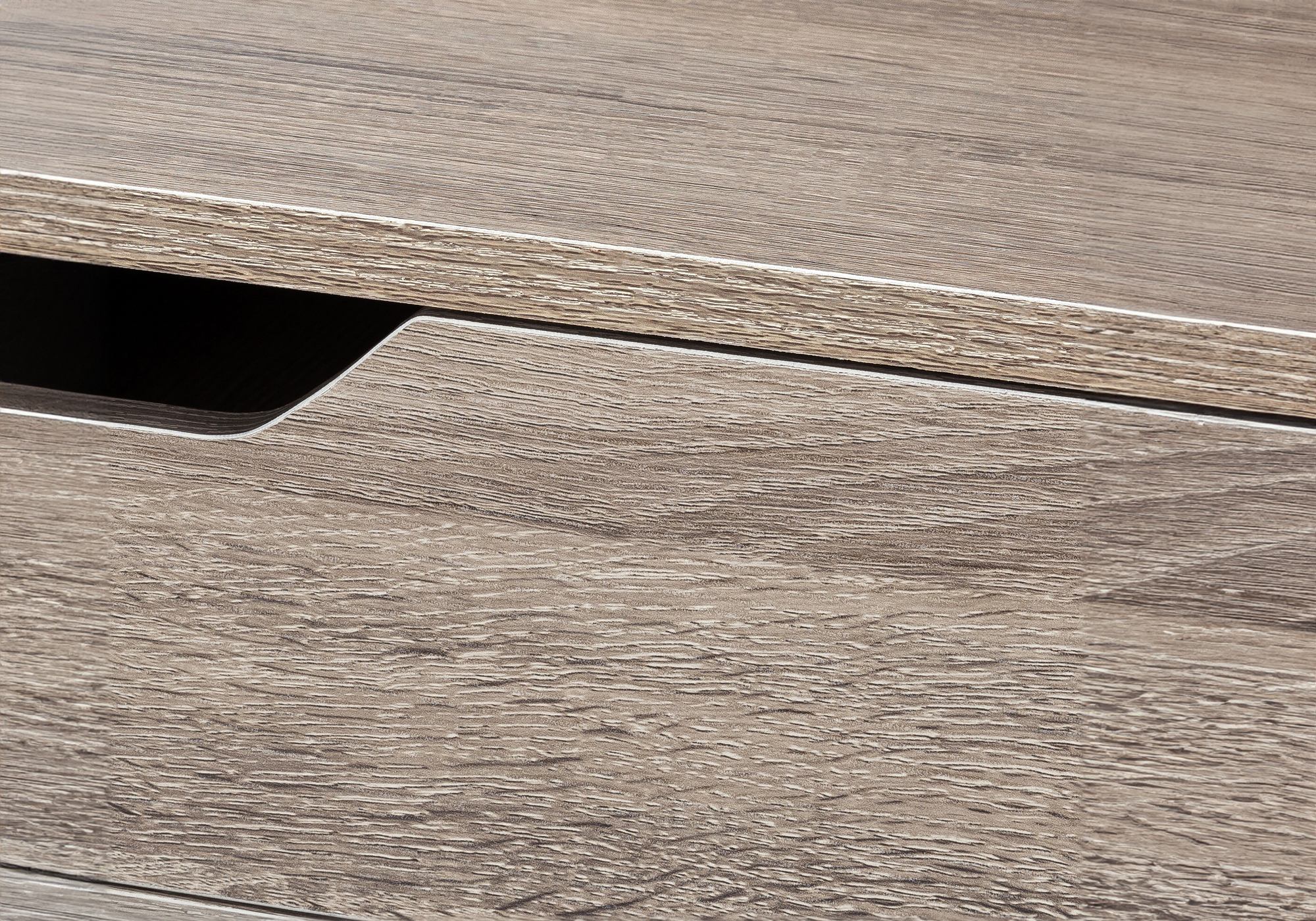 A stylish study in contrasts, this streamlined computer desk will add style to any room. Finished in a dark taupe wood-look laminate, the desktop has a substantial appearance thanks to an ample work surface and built-in drawers. The 2 storage drawers are wide and deep, offering room for supplies like writing materials and even letter- and legal-size papers. Supporting the top is a sturdy base in a contrasting black finish with slender metal legs that are recessed for a striking look. With its clean design and compact size, this modern laptop desk is ideal for smaller home offices and is attractive enough to also serve as an accent table.