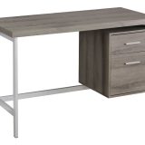 Looking to elevate your home office or study space? Look no further than this fashionable style 48″l computer desk in a wood-look taupe brown laminate finish with a grey metal frame. The storage drawers to keep everything organized, this contemporary style desk includes a handy file drawer for standard and legal sized folders, along with a large top drawer on top for your office essentials within reach. The spacious, easy to clean top makes it a breeze to maintain, while the reversible configuration allows for a left or right set-up to fit your space to your convenience. Durably designed and easy to assemble, this desk not only offers a functional workspace but also includes a 5 year limited warranty for your peace of mind. Whether working on your laptop, writing a term paper, or simply needing a dedicated area to study, this modern desk is finished on all sides to place anywhere in a space. Upgrade your work environment with this sleek and stylish computer desk with closed storage to create a productive and chic space that inspires.