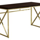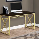 Space saving is a breeze with this compact desk that is sized for small homes, apartments or condos. Featuring a modern, wide open design, this desk finished in a dark brown, espresso wood-look is equally functional as a computer desk or writing table. A sturdy gold metal X-design base ensures stability and offers lots of space to push in a chair. The thick panel top is perfect for a laptop/tablet, a lamp, a notebook and some important supplies to get the job done.