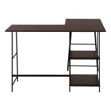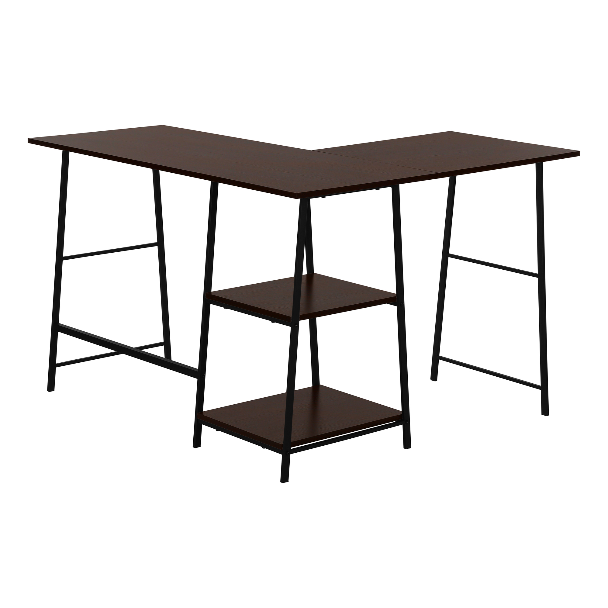 Make your corner computer desk work as hard as you do. This desk delivers style and functionality from top to bottom, starting with its spacious desktop in a smooth, dark brown espresso finish. Sawhorse-style legs in metal are put to work as supports for 2 open shelves that can be used to display books, small storage boxes, or other items. This unique L-shaped writing desks’ compact design and industrial style maximizes space and storage potential so that you can maximize productivity.