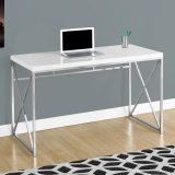 Space saving is a breeze with this compact desk that is sized for small homes, apartments or condos. Featuring a modern, wide open design, this desk finished in glossy white is equally functional as a computer desk or writing table. A sturdy chrome metal X-design base ensures stability and offers lots of space to push in a chair. The thick panel top is perfect for a laptop/tablet, a lamp, a notebook and some important supplies to get the job done.