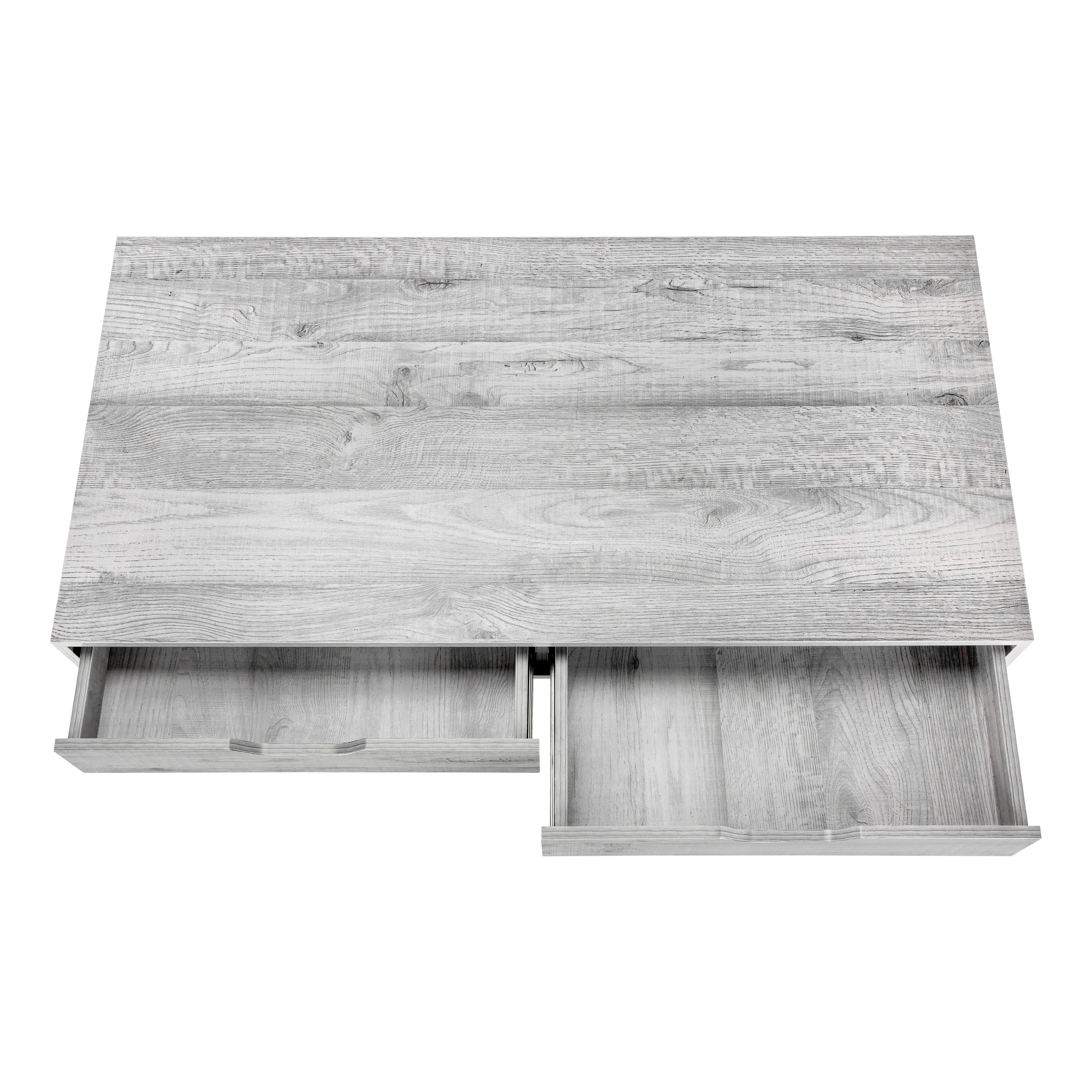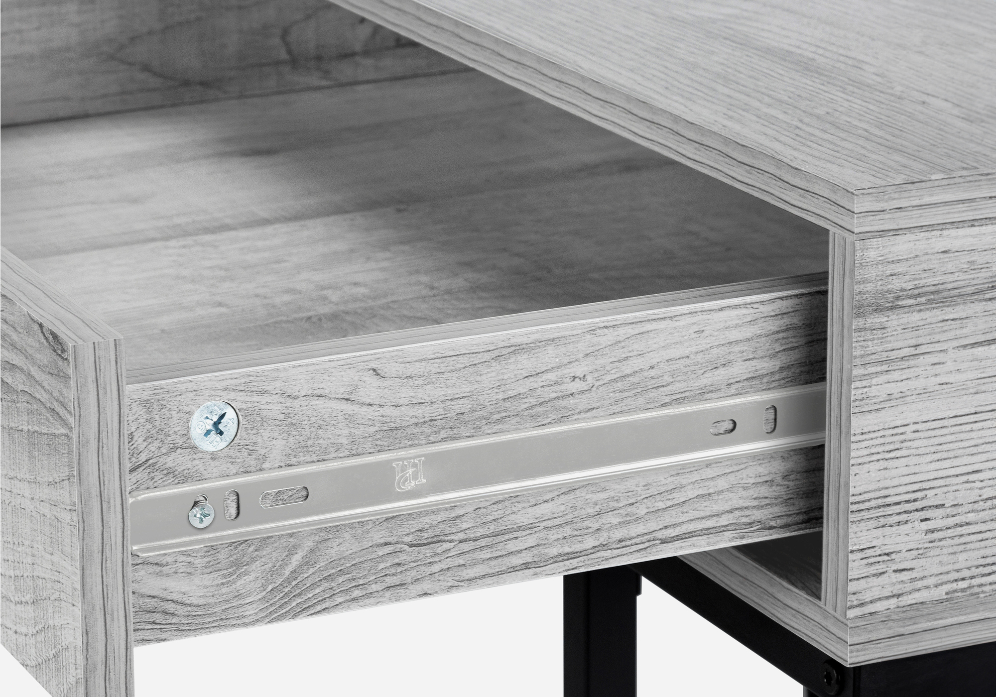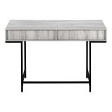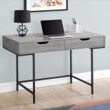 A stylish study in contrasts, this streamlined computer desk will add style to any room. Finished in a grey wood-look laminate, the desktop has a substantial appearance thanks to an ample work surface and built-in drawers. The 2 storage drawers are wide and deep, offering room for supplies like writing materials and even letter- and legal-size papers. Supporting the top is a sturdy base in a contrasting black finish with slender metal legs that are recessed for a striking look. With its clean design and compact size, this modern laptop desk is ideal for smaller home offices and is attractive enough to also serve as an accent table.