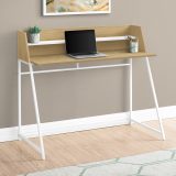 Look at your home office from a different angle with this computer desk featuring a storage hutch. Finished in a natural wood-look laminate, the compact desktop has side panels that slant to seamlessly align with the attractive, trapezoid-shaped metal legs for a clean look. The hutch includes 1 long shelf in a contrasting white finish that is the ideal size to hold small items like wireless speakers or a block of sticky notes. Supporting the desktop is a sturdy metal base in white with a support bar on back that runs parallel to the shelf. This contemporary laptop or writing table with a space-saving design is a great choice if you use your living room or bedroom as a home office.