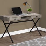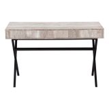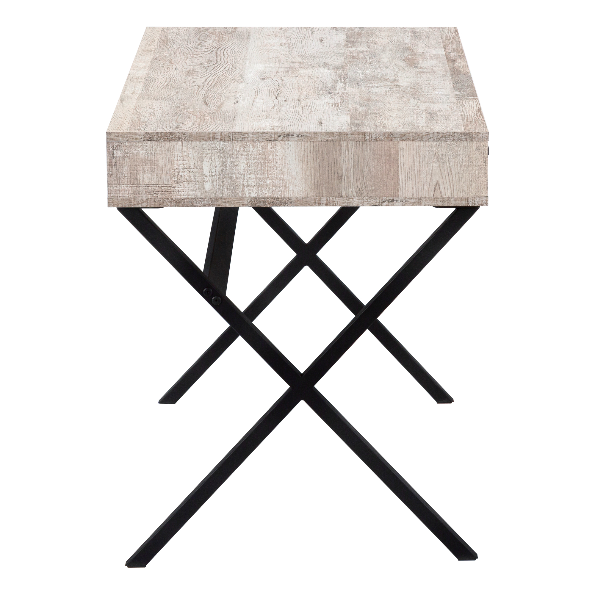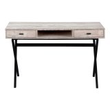 This widely-applicable industrial style desk finished in a taupe reclaimed wood look is equally functional as a computer desk, writing table or study centre. Sized for small homes, apartments or condos, space saving is a breeze thanks to this piece that is supported by a sturdy black metal X-design base to ensure stability and a comfortable work environment. This office desk is equipped with two convenient and easy-open storage drawers for all you need to store away while not in use. With lots of space to push the chair in, the desk is compact and the thick panel top has the perfect amount of surface space for a laptop/tablet, lamp, notebook and some important supplies to get the job done.