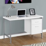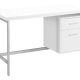 Looking to elevate your home office or study space? Look no further than this fashionable style 48″l computer desk in a white laminate finish with a grey metal frame. The storage drawers to keep everything organized, this contemporary style desk includes a handy file drawer for standard and legal sized folders, along with a large top drawer on top for your office essentials within reach. The spacious, easy to clean top makes it a breeze to maintain, while the reversible configuration allows for a left or right set-up to fit your space to your convenience. Durably designed and easy to assemble, this desk not only offers a functional workspace but also includes a 5 year limited warranty for your peace of mind. Whether working on your laptop, writing a term paper, or simply needing a dedicated area to study, this modern desk is finished on all sides to place anywhere in a space. Upgrade your work environment with this sleek and stylish computer desk with closed storage to create a productive and chic space that inspires.