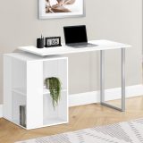 This sleek and chic modern designed desk with storage on all sides, makes it the ideal computer desk for compact spaces. It starts with a spacious clean-lined desk-top to place your laptop, with a smooth bright white finish on all sides to place it anywhere in a room. Making it even more productive, this desk is attached to a lower bookcase that is open on all sides, which can be assembled on the left or right. It includes a total of 8 fixed shelves for plenty of organization and storage of books, documents, and your favorite decorative objects. Supported with a strong u-shaped silver metal leg, this is the ideal desk for a student or someone carving out a small home office with a contemporary style. Assembly is required.