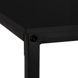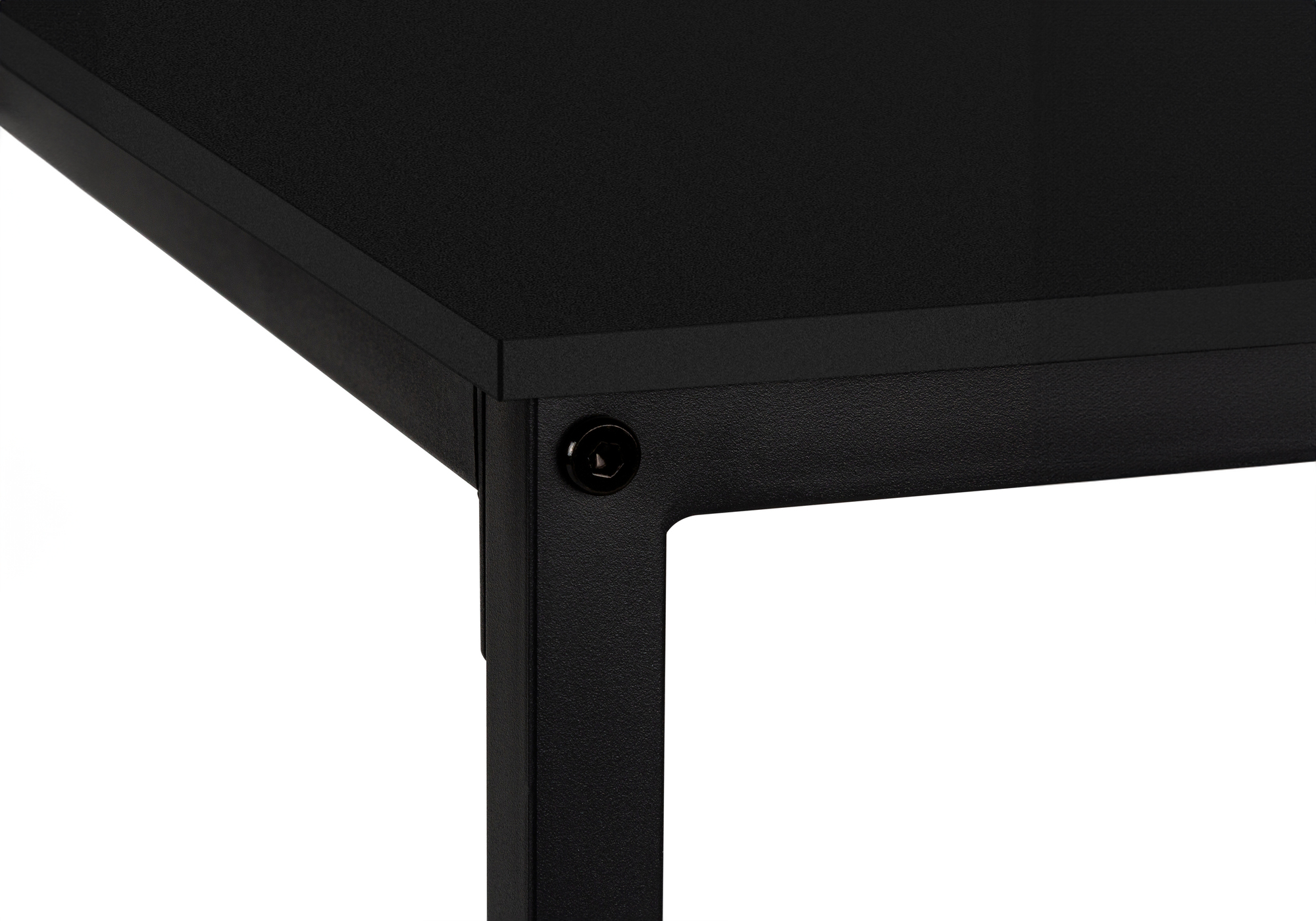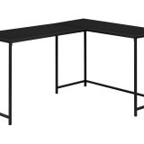 Delivering the best of both worlds, this corner computer desk is both spacious and compact, with a streamlined style that is a great choice for smaller home offices. Finished in a black laminate, the large desktop easily accommodates everything you need to be productive and has room to spare for displaying decorative items. Supporting the desktop is a slender metal base in a matching black finish. The open design of the metal base leaves plenty of room underneath the desktop to stretch your legs and place a computer tower. This L-shaped computer desk is designed for placement in a corner to maximize space in a home office.