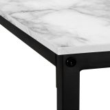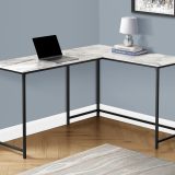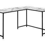 Delivering the best of both worlds, this corner computer desk is both spacious and compact, with a streamlined style that is a great choice for smaller home offices. Finished in a white marble-look laminate, the large desktop easily accommodates everything you need to be productive and has room to spare for displaying decorative items. Supporting the desktop is a slender metal base in a complementary black finish. The open design of the metal base leaves plenty of room underneath the desktop to stretch your legs and place a computer tower. This L-shaped computer desk is designed for placement in a corner to maximize space in a home office.