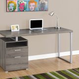 Elevate your home office with this sleek and stylish computer desk. The 60″l surface provides a spacious and functional workspace for studying, writing, or working on your laptop. The fashionable wood-look taupe brown laminate finish and grey metal frame creates a contemporary look that is sure to impress. With a 5 year limited warranty, this desk is durably designed and built to last. The easy to clean top ensures that your workspace always looks pristine, while the open cubby and closed storage drawers keep your office essentials organized and within reach. The handy file drawer accommodates standard or legal sized folders, perfect for keeping important documents secure and easily accessible. With a reversible configuration, this computer desk can be set up to fit your space perfectly, whether you prefer a left or right orientation. Finished on all sides, this desk can be placed anywhere in the room to suit your needs. Easy to assemble with illustrated instructions and all hardware included, this fashionable style desk is ready to elevate your hybrid work experience.